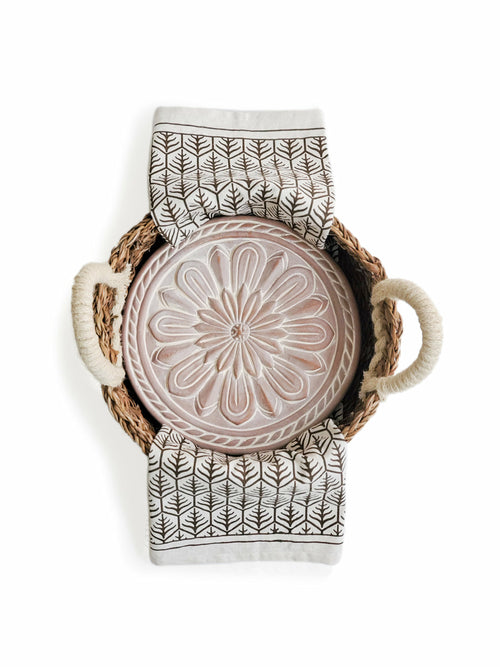 Add a bit of artisan-inspired style to the kitchen with a terracotta bread warmer and hand screen printed tea towel. Engraved with a flower design and cut to fit neatly into a round basket, this terracotta special bread warmer is naturally insulating, and the basket itself has been handwoven from sustainably grown seagrass. The tea towel is great for drying dishes or hands in the kitchen, lining a bread basket. They are the best gift items for anyone who loves bread!